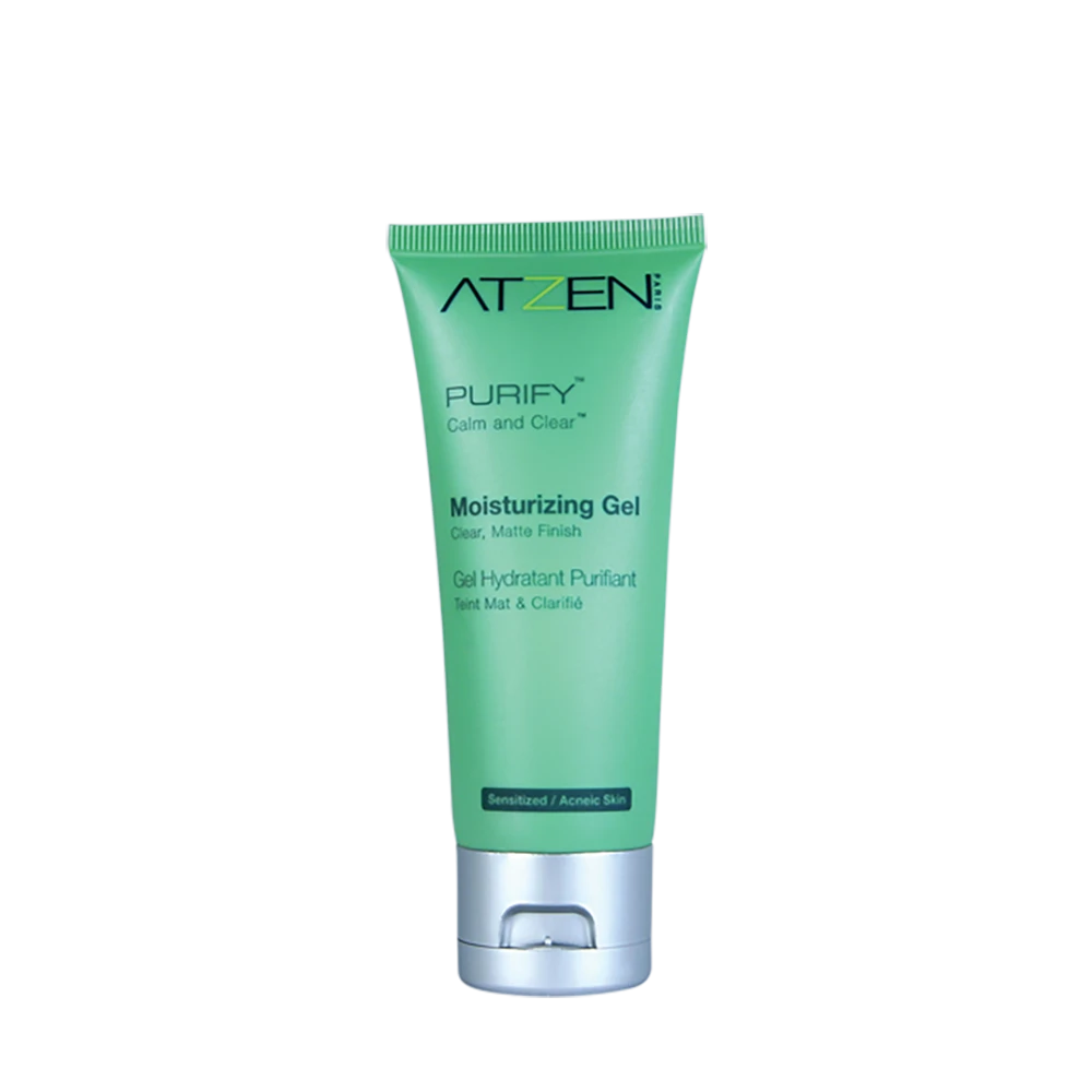 ATZEN Moisturizing Gel is your answer to the complex needs of oily or acneic skin. Keeps skin fresh for 16+ hours, free of shine & sensitivity, while correcting the causes of skin’s imbalance. Safe around the eyes. Excellent non-comedogenic make up base. Gives great skin texture and appearance to teens, men, and women who wear no makeup.