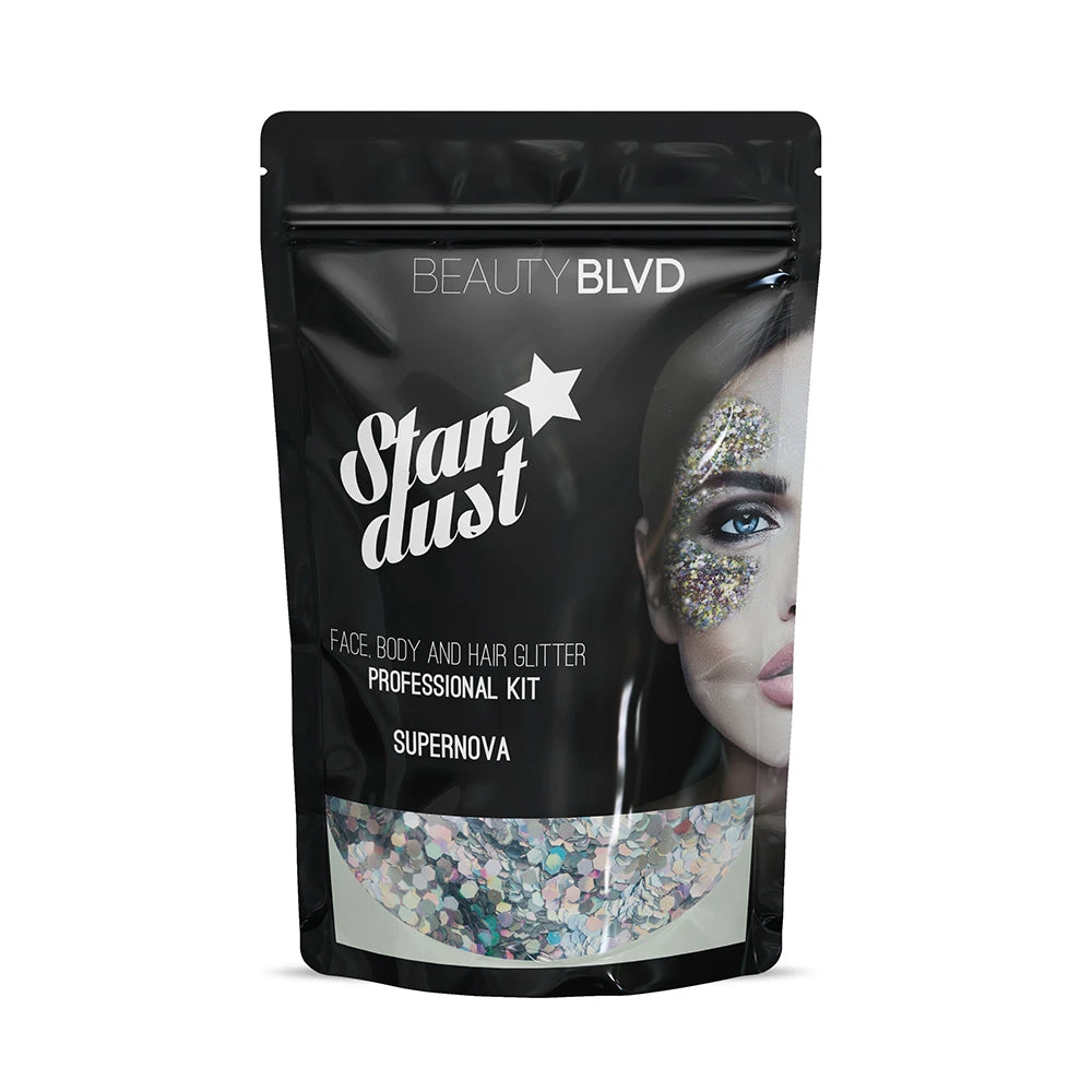 Apply Stardust Binding Gel (sold separately) across the area you wish to apply the Stardust Glitter on (please keep away from the eye area). Apply the Cosmetic Glitter directly to skin with the specially designed BeautyBLVD brush applicator (brush sold separately). Dampen brush to pick up the glitter. You can layer up with more glitter if the first application is not enough. I mean the more glitter the better…right? For removal please use water or cleanser over the area stardust has been applied.