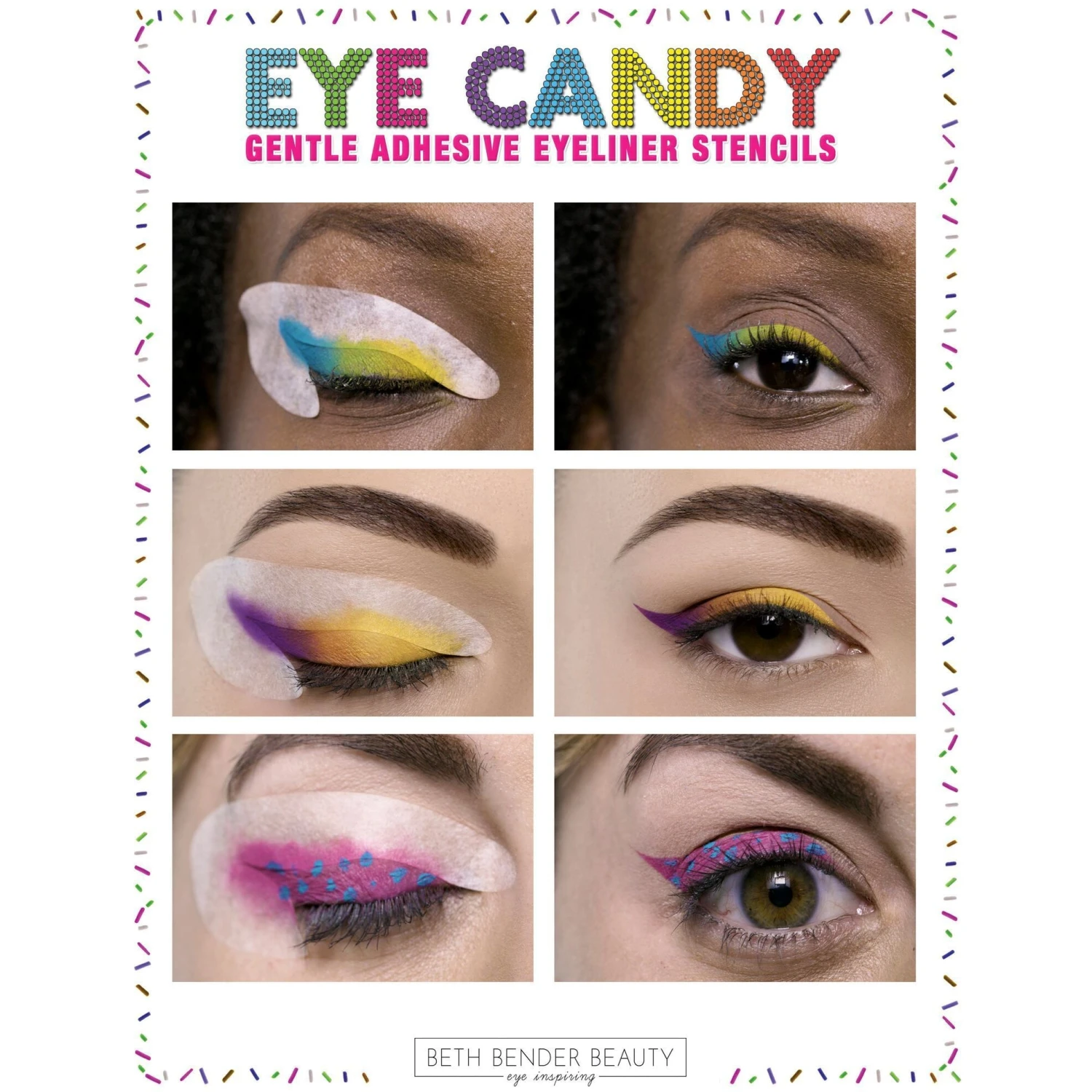 - Eye Candy Eyeliner Stencils are multi-functional. If you desire just the perfect point and don’t want to complete the full look, simply cut/tear the top arm of your stencils so they are the same length as the bottom arm of your stencils. The top arm of your Eyeliner Stencil can be used to create a Cut Crease and Bottom Liner.