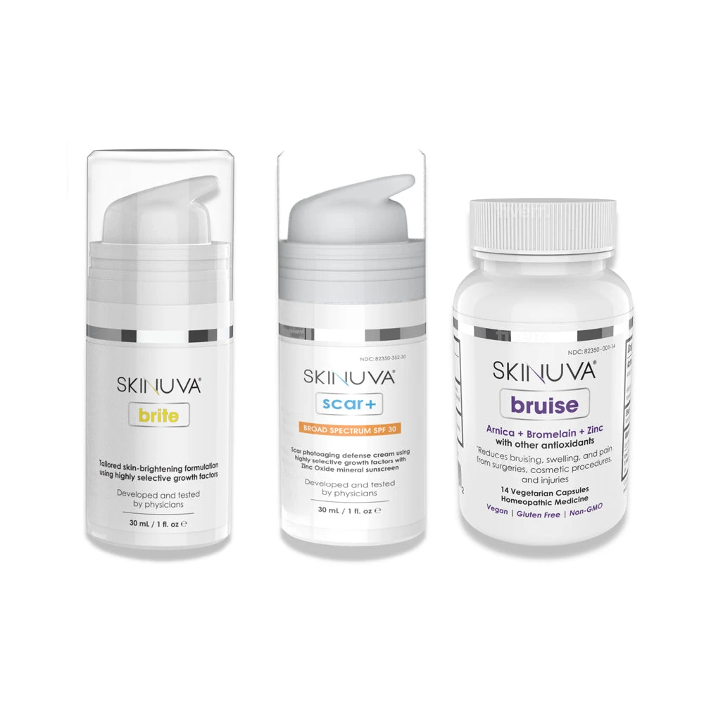 While Skinuva Scar+ and its ingredients help reduce the appearance of scars with broad spectrum UVA/UVB protection, Skinuva Brite can also help improve the appearance of hyperpigmentation. Skinuva Bruise can help expediting the body’s natural healing process from surgeries, cosmetic procedures, and injuries. Depending on the procedure, these three products can be suitable in your pre and post treatment recovery procedure.